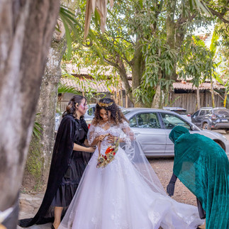 A decisão de usar um vestido da La Fiancée, deixou a Thaiane um pouco ansiosa. Ela nos contou que ficou com receio no início, preocupada se seria apropriado usar um vestido de noiva em um casamento a fantasia. Mas disse que o apoio caloroso da equipe aqui da loja deu ainda mais confiança para ela.